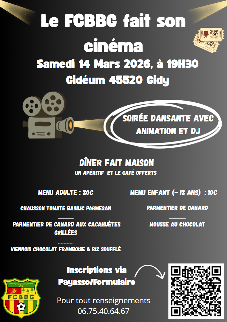 🎬 Le FCBBG fait son cinéma Le samedi 14 mars 2026, le FCBBG fait son cinéma au Gideum de Gidy. Nous vous attendons nombreux et nombreuses à partir de 19H30 pour une soirée à ne pas manquer ! 🟡🔴